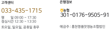 | 주소 : 강원도 홍천군 두촌면 숯고개길 30 통신판매업 신고 : 2019-강원홍천-0093호 | 연락처 : 033-435-1715 | FAX : 033-435-1716 | 개인정보 보호책임자 : 김선화 | 대표자 : 변상직 contact : hchj2016@naver.com for more information. hosting by ㈜ 가 비 아 씨 엔 에 스 |